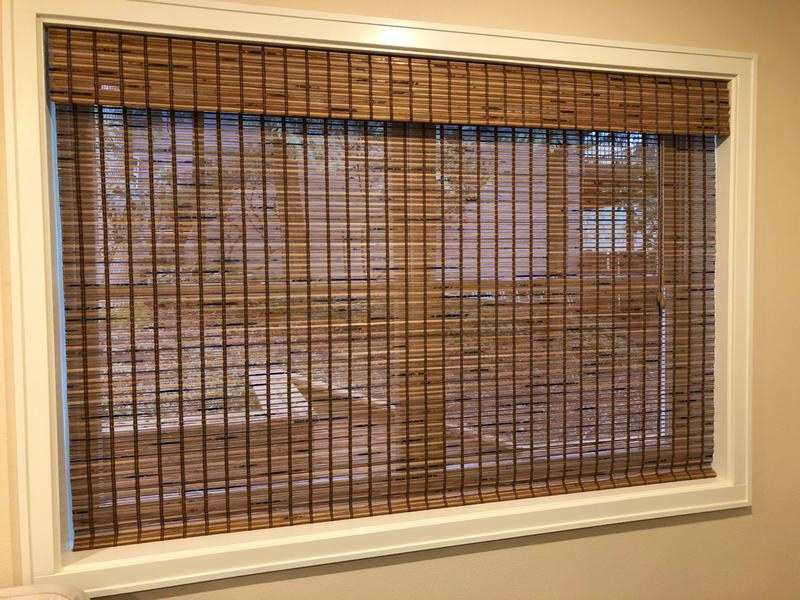 We have bamboo woven shades in several of our rooms. Inside or outside mount available. The shade hangs off the back of the headrail and raises in soft folds. They get their characteristic texture and coloration from natural fibers like bamboos, reeds, jute and other grasses and woods. We offer privacy and blackout lining options on all of our bamboo shades except the advantage.